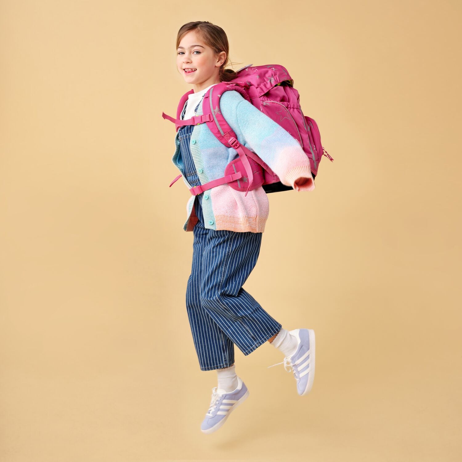 Mit dem Ergobag Schulrazenmotiv SternzauBär in pink und silbernen Sterne und Sternchen kommst du mit all den phantasievollen kindlichen Figuren wie einem Einhorn, einer Prinzessing oder einem Pegasus in dein Märchenschloss Schule und wirst diese zum Strahlen bringen.