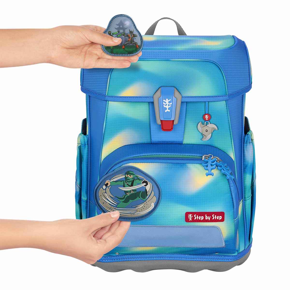 Das 5tlg. Schulranzenset von Step by Step mit dem gefährlichen Ninja Zazu besteht aus dem Schulranzen Cloud FLASH, einem komplett bestückten Federmäppchen, einem Schlamperetui sowie einem Sportbeutel und den Magic Mags zum Individualisieren Deines Ranzens. Der leichte Cloud Schulranzen von Step by Step ist besonders für zierliche und kleine Kinder mit einer Körpergröße zwischen 100 cm und 150 cm bestens geeignet.