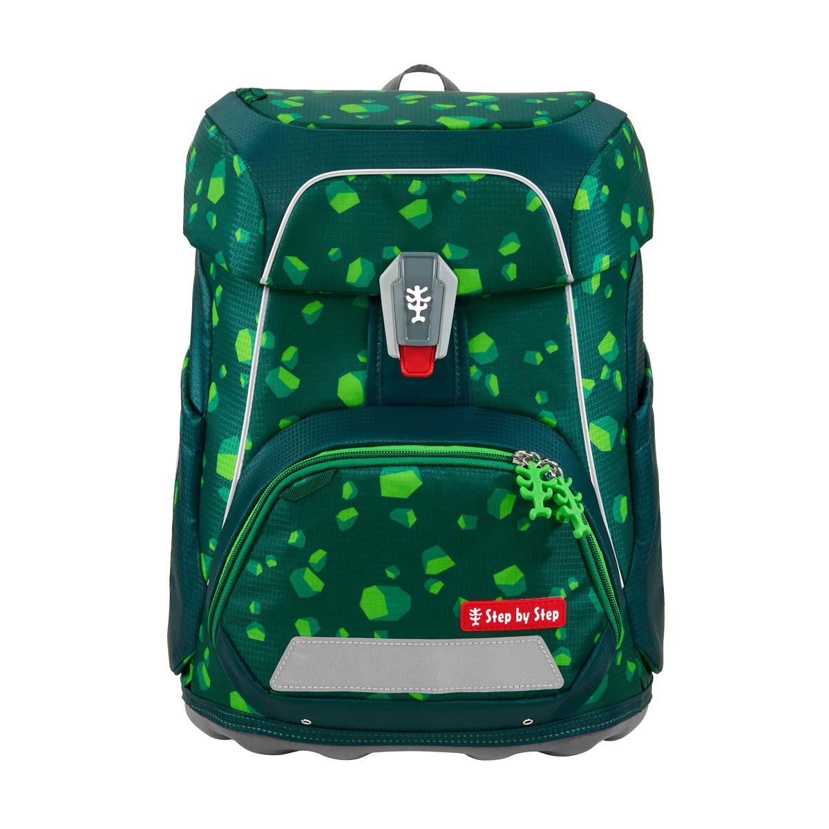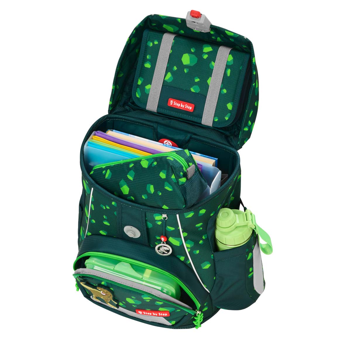Kräftiges Grün trifft auf gefährlichen Dinosaurier: das 5-teilige Step by Step Schulranzenset Dino Targo aus dem Schulranzen FIT, einem passenden Federmäppchen, einem Schlampermäppchen für Kleinteile, einem Sportbeutel und den passenden Magic Mags zur individuellen Gestaltung.
