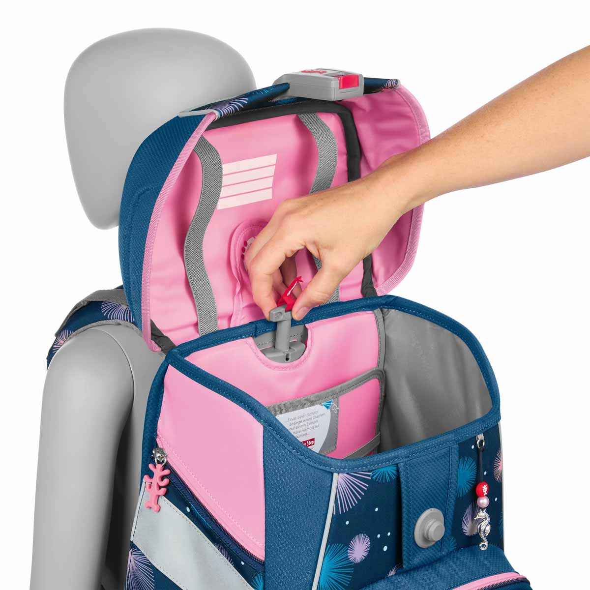 Die Ausstattung mit Anhebe-/Aufhängeschlaufe, Bücherfach, Federmäppchenhalterung im Deckel, gepolstertem Tragegriff, isolierter Fronttasche, Magnetverschluss und zwei Seitentaschen ist optimal auf Schulkinder ausgerichtet.